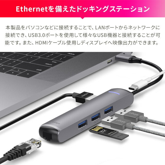 お取り寄せ elago USB C ハブ 6 in 1 USB Type C ドッキングステーション 4K HDMI出力 PD パワーデリバリー 充電 対応 USB-C / USB3.0 / HDMI / LAN ポート 搭載 マルチ 変換 アダプタ MacBook / Mac OS / Windows OS/ Chrome OS 各種対応 6in1 MULTI HUB 【製品仕様】 ◆ パッケージ内容 : マルチハブ × 1個 ◆ 製品サイズ : 約 28cm × 2.8cm × 1cm ◆ 製品重量 : 約 50g ◆ 使用素材 : アルミニウム合金ほか 【製品特徴】 ◆ インターフェイス : Type-C コネクタ × 1, Type-C ポート × 1, USB 3.0 ポート × 2, HDMI ポート × 1, SD スロット × 1, マイクロSD スロット × 1 ◆ HDMIポート : 最大4K/30Hz ◆ USB Type-C ポート : Power Delivery 対応 ( PD 3.0 / 最大87W ) ◆ 対応SDカード : SD / SDHC / SDXC / Micro SD / Micro SDHC / Micro SDXC 各種 ◆ USB3.0ポート : 5Gbps, USB2.0 / USB1.1 下位互換対応 ◆ 対応電圧 : 5V - 20V ◆ 対応電流 : 220mA - 3000mA 【Ethernetを備えたドッキングステーション】 本製品をパソコンなどに接続することで、LANポートからネットワークに接続でき、USB3.0ポートを使用して様々なUSB機器と接続することが可能です。