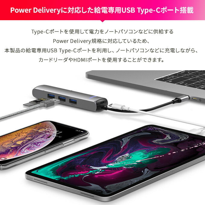 【Power Deliveryに対応した給電専用USB Type-Cポート搭載】 Type-Cポートを使用して電力をノートパソコンなどに供給するPower Delivery規格に対応しているため、本製品の給電専用USB Type-Cポートを利用し、ノートパソコンなどに充電しながら、カードリーダやHDMIポートを使用することができます。